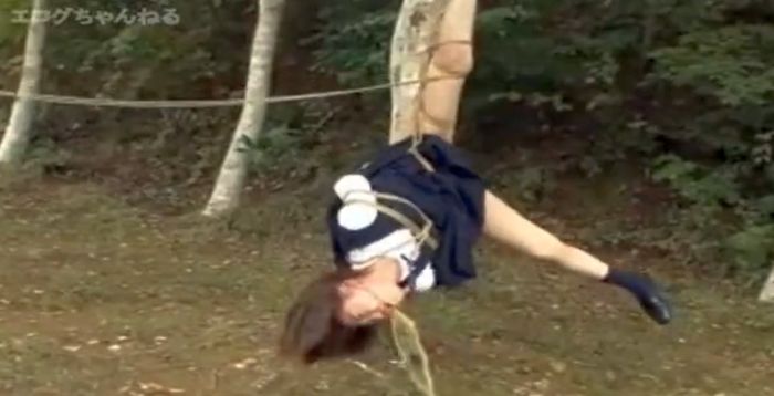 ●トラックの荷台で大量の浣腸をされたまま森で片脚吊りされてしまうJK。調教者にくるくると回されてしまい、浣腸液も噴き出すが回転で気持ち悪くなってしまいゲロも吐いちゃうwww♡